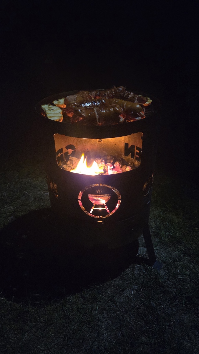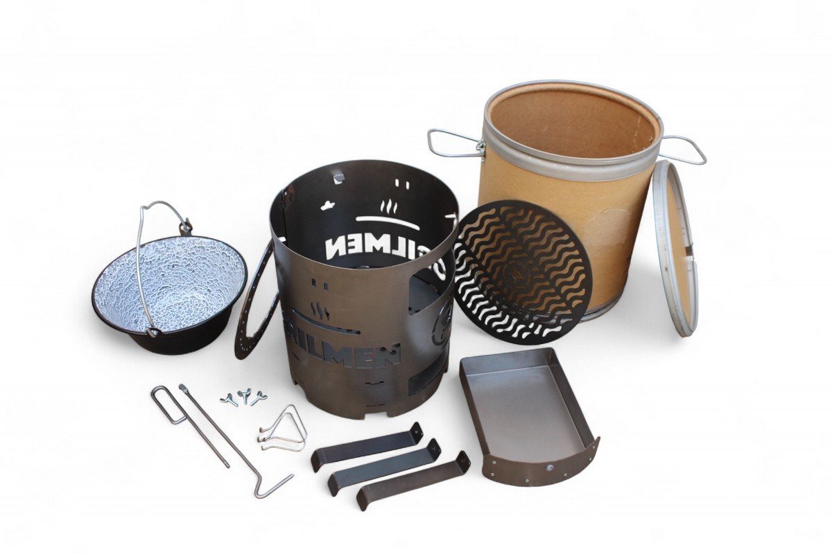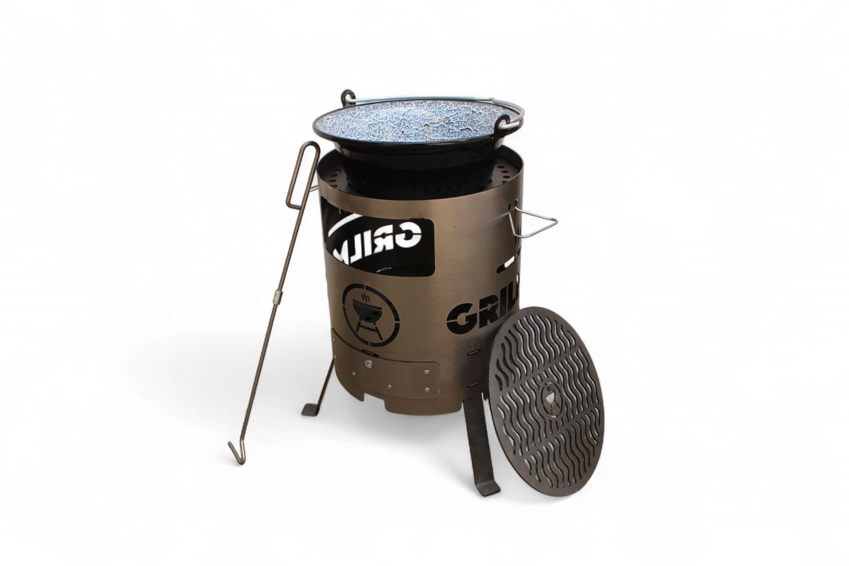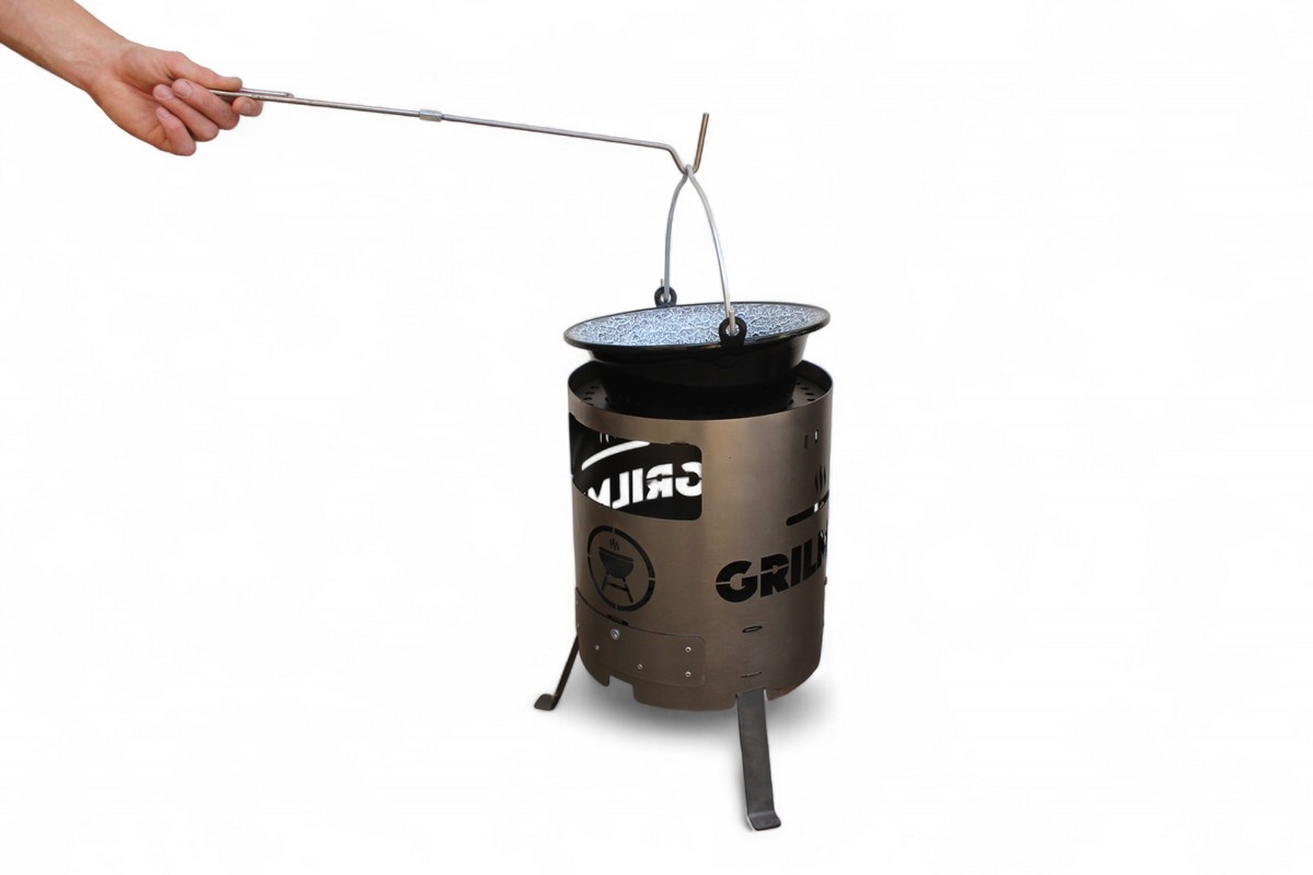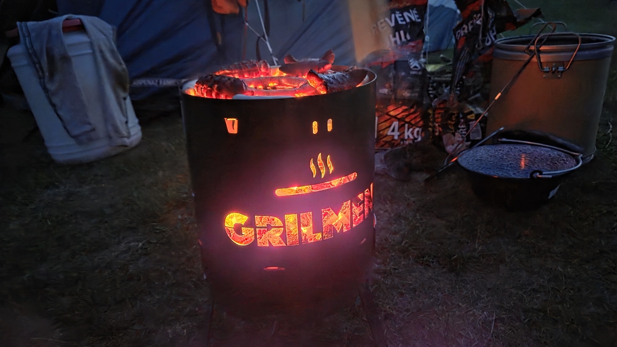 Grilovat můžete na uhlících z ohně nebo v grilu použít dřevěné uhlí nebo grilovací brikety. A ani to není vše. Rošt grilu můžete v mžiku z grilu (za použití žáruvzdorných rukavic) zase vyndat a nahradit ho mezikružím, do kterého vložíte čtyřlitrový smaltovaný kotlík a uvaříte si třeba polévku, čaj, kotlíkový guláš nebo buřty na pivu (viz foto).